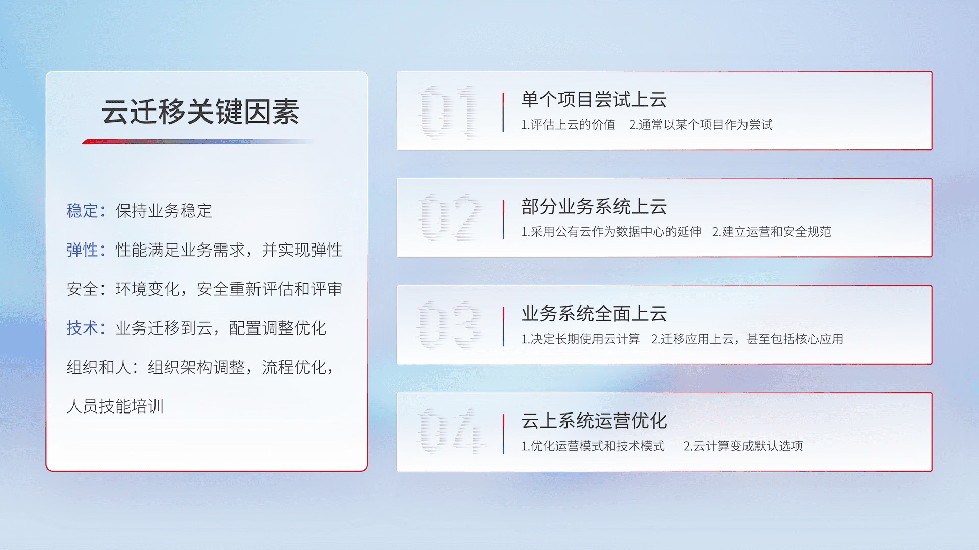 结合实际业务,,从规划设计、、云平台选型、、云原生改造、、、数据迁移、、、、集成交付,,,迁移全过程为客户识别最佳上云路径,,,做好风险识别管理,,设计网络架构、、、身份权限、、安全审计合规、、操作审计、、、日志审计、、监控告警策略、、、、多站点容灾设计等,,,,对云上基础设施进行整体规划,,提升IT治理水平,,以满足弹性、、高可用、、高性能的需求。。